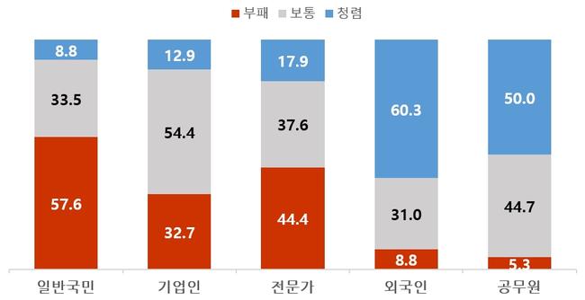 공직사회에 대해서도 ‘부패하다’는 응답은 일반국민 39.1%, 전문가 30.8%, 기업인 22.6%, 외국인 8.8%, 공무원 1.1% 순으로 나타났다. 기업인(31.9%→22.6%), 전문가(36.1%→30.8%), 외국인(14.2%→8.8%), 공무원(3.1%→1.1%) 등은 개선됐지만, 일반국민은 35.5%에서 39.1%로 3.6%p 높아져 체감도 제고가 과제로 제시됐다.