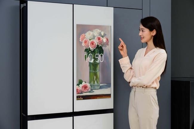 삼성전자 모델이 `비스포크 AI 패밀리허브` 냉장고의 `생성형 배경 화면`을 소개하고 있다.