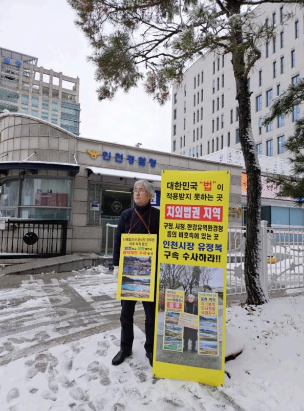본 기자는 인천경찰청과 인천미추홀구청 앞에서 민주주의 국가에서는 "법"이 올바르게 적용되어야 함에도 불구하고, "치외법권지역"이 있음을 규탄하며 일인시위를 하였다.