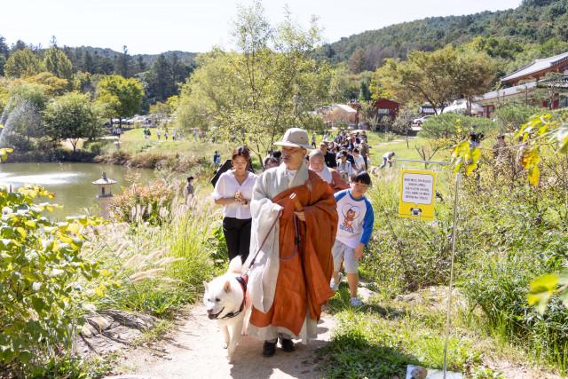 `반려견과 함께하는 선명상 축제` 참가자들이 제25교구 봉선사교구장 호산 스님과 함께하는 `반려견과 함께하는 마음챙김 걷기명상` 프로그램에 참여하고 있다