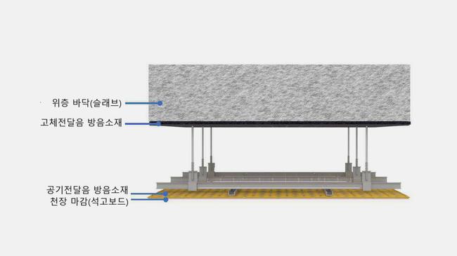 층간소음은 바닥과 벽체와 같은 고체전달음이 공간을 통해 공기전달음으로 바뀌며 발생하는데, 두 전달음의 저감에 효과적인 각각의 방음소재를 활용해 효율을 높인 것이다.