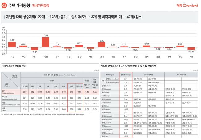 한국부동산원이 발표한 2024년 10월 전국주택가격동향조사에 따르면, 매매가격지수는 전국적으로 0.07% 상승했으며, 수도권(0.22%)과 서울(0.33%)이 상승세를 보였다.