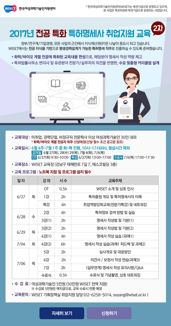 한국여성과학기술인지원센터(소장 한화진, 이하 WISET)가 6월 27일~7월 6일까지 강남구 역삼동 WISET 아카데미 교육장에서 ‘2017 전공특화 특허명세사 취업지원교육’을 실시한다.