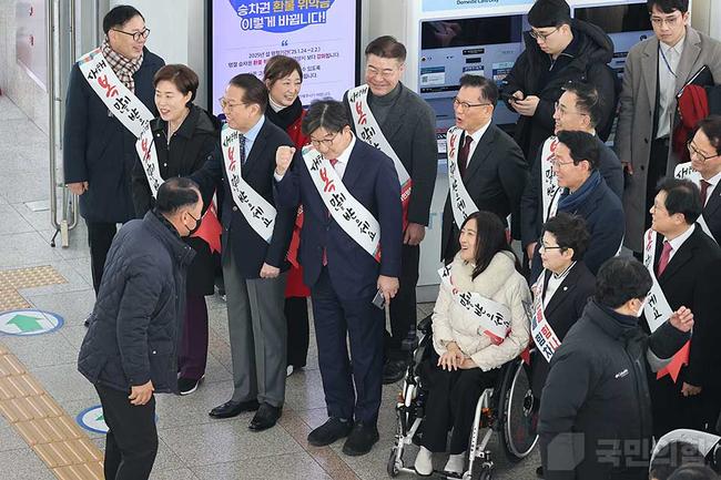 국민의힘 권영세 비상대책위원장을 비롯한 당 지도부는 24일 오전 서울역을 찾아 귀성길에 오른 시민들을 향해 편안하고 안전한 명절이 되길 인사하고 있다.