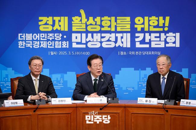 이재명 더불어민주당 대표가 5일 국회에서 열린 한국경제인협회(한경협) 임원진과의 민생경제 간담회에서 “기업과 정치권이 경제 발전을 위해 함께 노력해야 한다”고 강조했다.