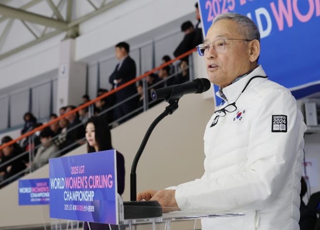 유인촌 문화체육관광부 장관이 15일 의정부실내빙상장에서 열린 2025 LGT 세계여자컬링선수권대회 개막식에서 축사를 하고 있다.