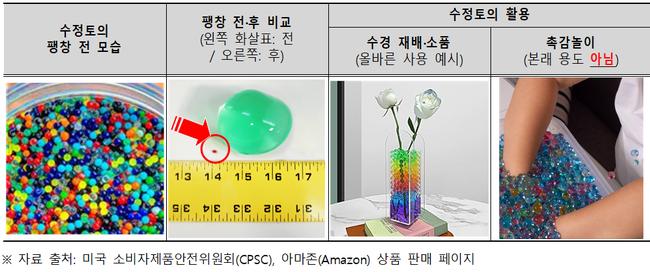 어린이 삼킴사고 주의보… 수정토(워터비즈), 장 폐색 유발 위험 - 물 흡수하면 100배 팽창… 삼킬 경우 장 폐색 등 중대 상해 우려 - 최근 5년간 국내 어린이 사고 102건… 67%는 걸음마기 연령대서 발생 - 美 영아 사망 사례도… 소비자원 “놀이용 사용·구매 지양해야”