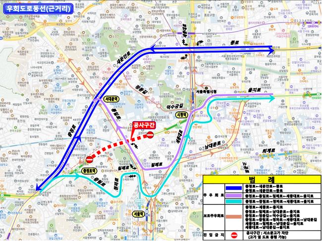 근거리 우회도로 안내[시청↔충정로] - 주우회로: 충정로-새문안로-종로 / 충정로-통일로-칠패로-세종대로-을지로 / 충정로-중림로-청파로-세종대로-을지로