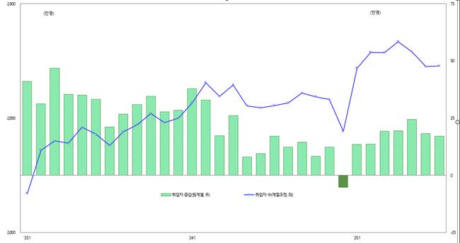 제조업(-7.8만 명)과 건설업(-9.2만 명) 고용 감소세는 다소 완화됐으나 여전히 부진했고, 농림어업은 집중호우 등 기상 악화 영향으로 4개월 연속 10만 명대 감소(-12.7만 명)를 기록했다.