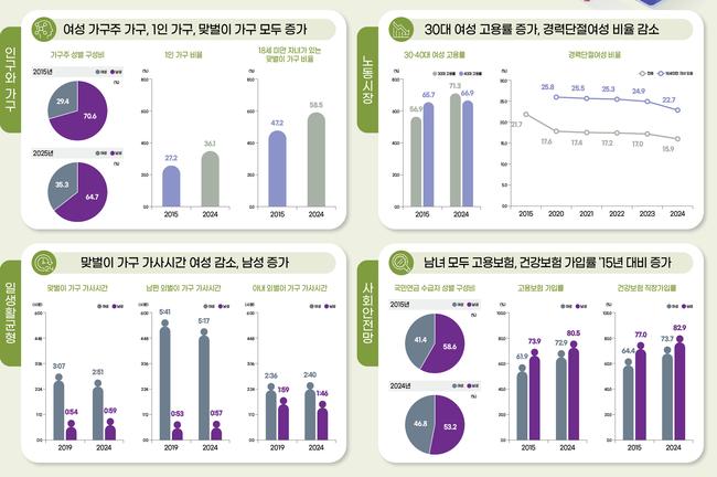 이번 통계는 인구·가구 구성, 노동시장, 일·생활 균형, 의사결정 참여 등 주요 지표에서 남녀 간 격차가 줄고, 특히 여성의 사회·경제 활동이 눈에 띄게 확대된 것으로 나타났다.