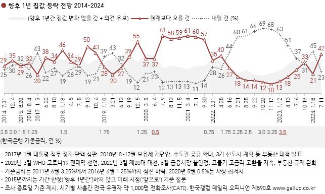 한국갤럽이 2024년 7월 9~11일 전국 만 18세 이상 1,000명에게 향후 1년간 집값 전망을 물은 결과 42%가 `오를 것`이라고 답했다. `내릴 것` 23%, `변화 없을 것` 26%, 의견 유보 10%다. 올 초 하락론 우위에서 반 년 만에 상승론 우위로 전환했다. 이는 2022년 대선 직후와 비슷한 수준이다.