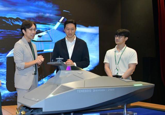 정기선 HD현대 부회장이 미래기술원 연구원들로부터 팔란티어와 공동개발 중인 무인수상정(USV) `테네브리스`에 대한 설명을 듣고 있다