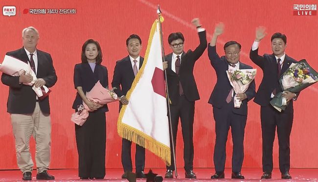 한 후보는 23일 경기 고양 킨텍스에서 열린 전당대회 대표 경선에서 당원 투표와 일반 국민 여론조사를 합산한 결과 과반인 62.8%를 득표, 결선투표 없이 승리를 확정했다.
