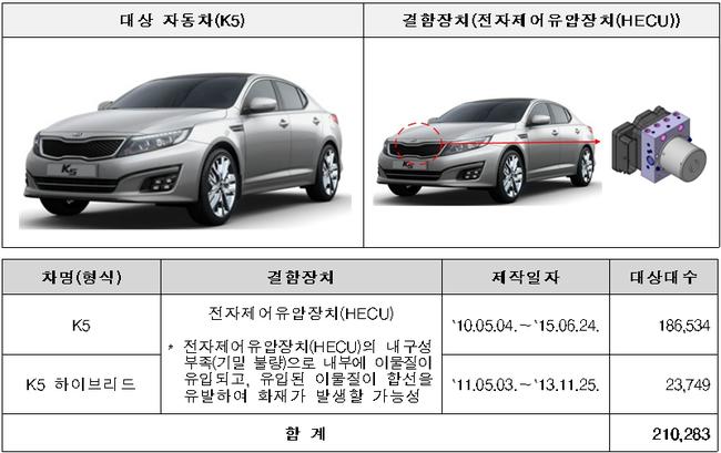 기아 K5 등 2개 차종 210,283대는 전자제어유압장치(HECU) 내구성 부족으로 7월 22일부터, 니로 EV 1,986대는 고전압배터리 전원차단장치 제조 불량으로 7월 24일부터 시정조치를 진행하고 있다.