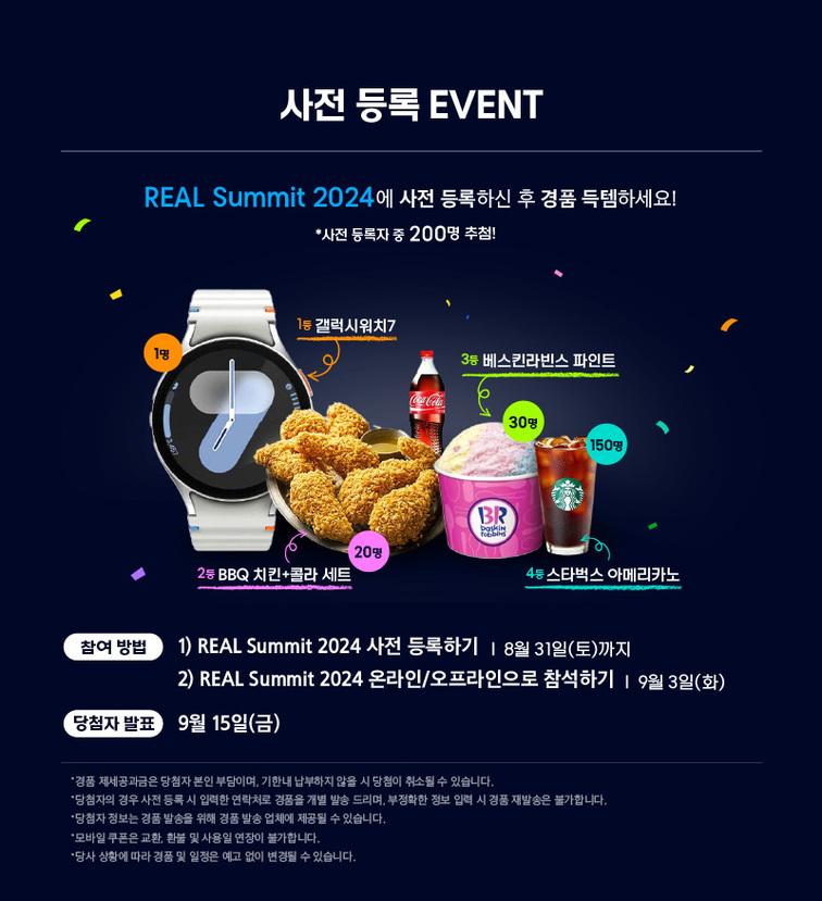 - REAL Summit 2024 지금 사전 등록 신청만 해도 경품이 쏟아진다!