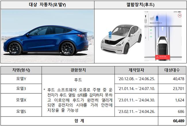 테슬라 모델Y 등 4개 차종 66,489대는 후드 소프트웨어 오류로 주행 중 운전자가 후드 열림 상태를 감지하지 못하여 안전에 지장을 줄 가능성으로 8월 22일부터 시정조치에 들어간다.