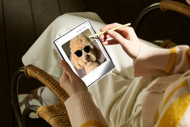 삼성전자 모델이 갤럭시 Z 폴드6으로 간단한 스케치를 정교한 AI 이미지로 변환하는 `스케치 변환(Sketch to image)` 기능을 시연하고 있다