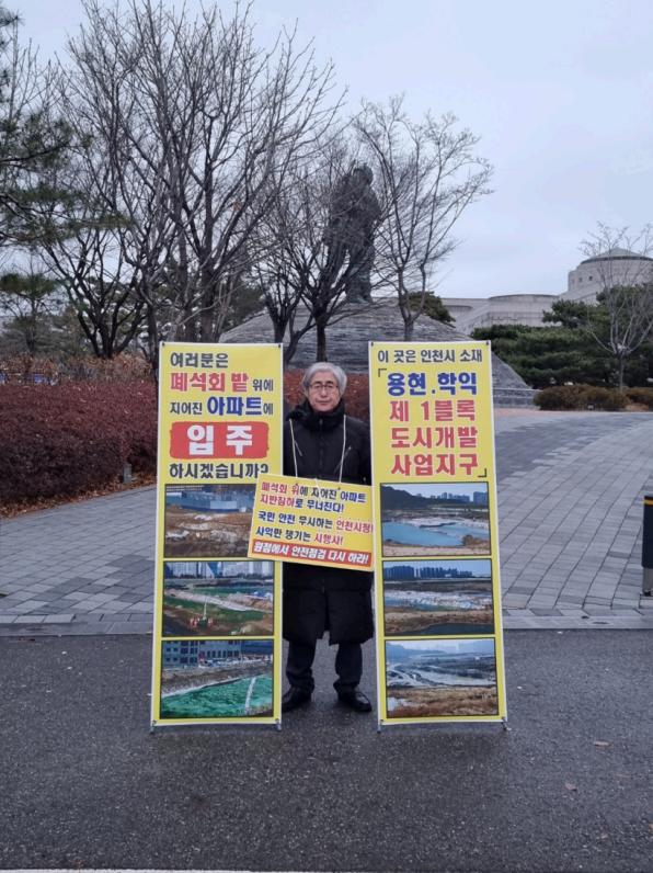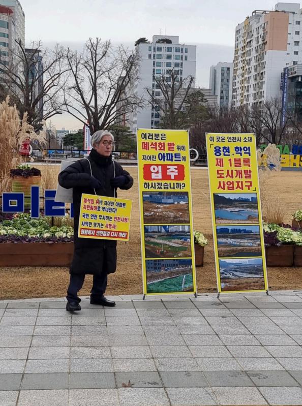 시위의 내용은 “인천시 소재 용현 . 학익 제1블록 도시개발 사업지구”내에서 일어나고 있는 법령위반 행위들을 알리고자 함이다.