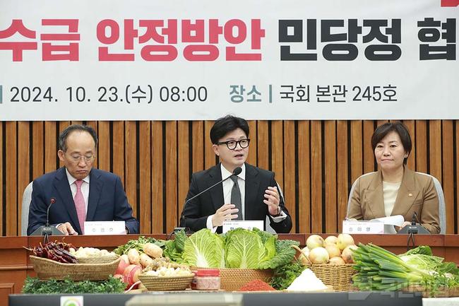 한동훈 당 대표는 10월 23일 오전 8시, 서울 여의도 국회에서 김장재료 수급 안정 방안을 논의하기 위한 민·당·정 협의회를 열었다.
