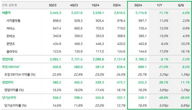 네이버㈜(대표이사 최수연)는 2024년 3분기 실적으로 매출 2조 7,156억 원과 영업이익 5,253억 원을 발표했다.