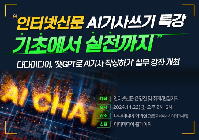 인터넷신문 솔루션 전문 기업 다다미디어는 11월 22일(금) 인터넷신문 기자 및 운영진을 대상으로 ‘생성형 AI 기사쓰기 실무 특강’을 진행한다고 밝혔다.