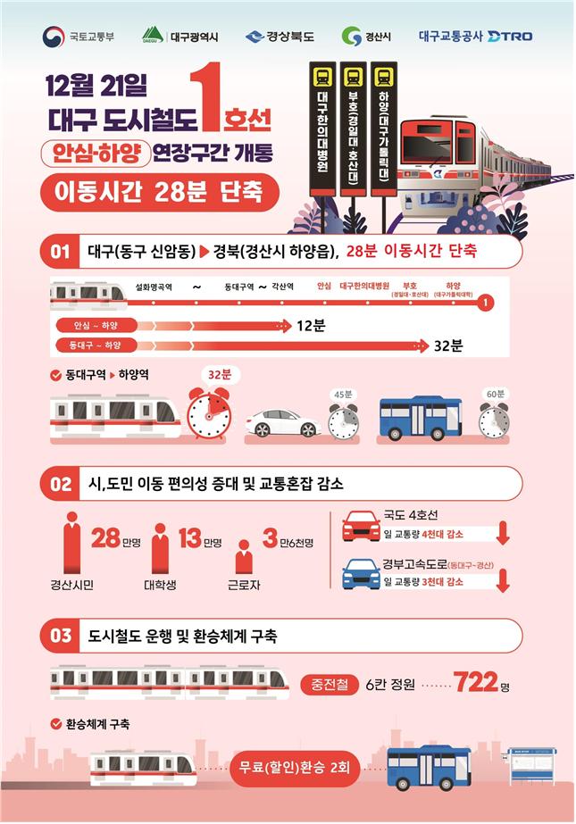 동대구~하양 간 이동시간이 기존 60분에서 32분으로 단축되며, 자가용(45분)이나 시내버스(60분)에 의존했던 기존 방식과 비교해 철도로 더 빠르고 효율적인 이동이 가능하다.