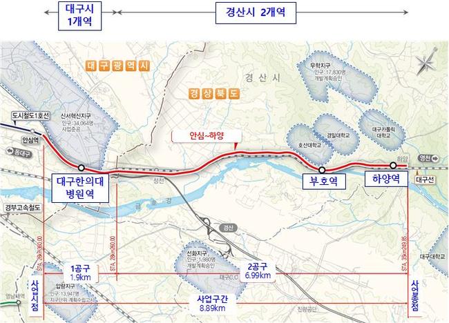 이번 연장선은 대구 도시철도 1호선을 안심역(대구광역시)에서 하양역(경상북도 경산시)까지 연장하는 8.89km 구간으로, 대구한의대병원역, 부호역, 하양역 등 3개 신규 역이 포함된다.