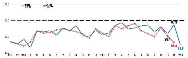 한국경제인협회(한경협)는 2025년 1월 기업경기실사지수(BSI) 전망치가 84.6으로 전월 대비 12.7포인트 하락했다고 발표했다. 이는 코로나19 초기였던 2020년 4월 이후 가장 큰 하락폭이다.