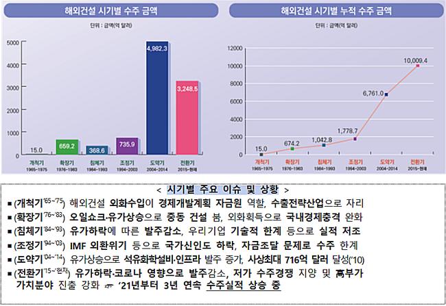 국토교통부는 2024년 해외건설 누적 수주 금액이 1조 달러를 돌파했다고 발표했다. 이는 반도체와 자동차에 이어 세 번째로 수출·수주 분야에서 이룬 쾌거로, 1965년 첫 해외수주 이후 59년 만이다.