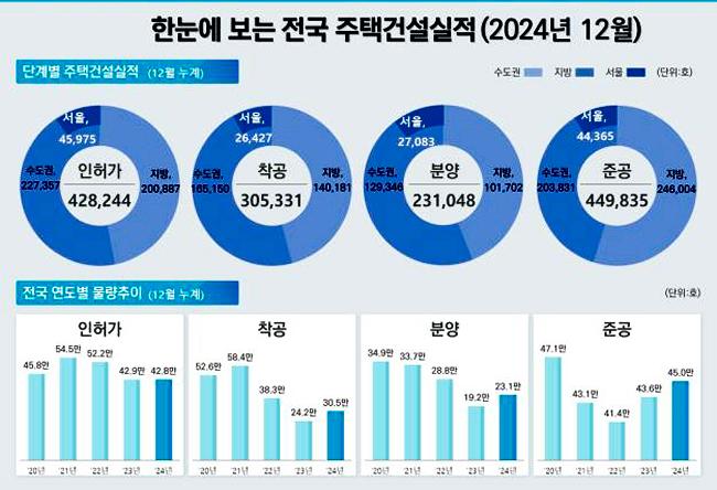 한편, 12월 주택 착공 실적은 6만5437호로 전월 대비 201.3% 증가했으며, 연간 착공 물량은 30만5331호로 전년 대비 26.1% 증가했다. 이는 공공주택 착공이 크게 늘어난 영향으로 분석된다.