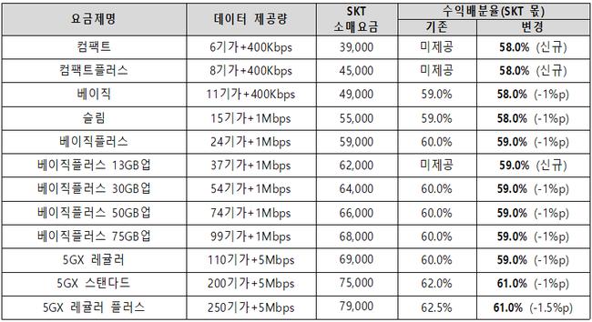 5세대 이동통신 요금제 확대 및 수익배분 대가 인하 내역