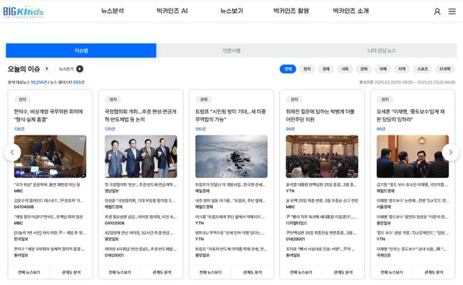 ‘빅카인즈’는 2016년부터 운영된 뉴스 빅데이터 분석 플랫폼으로, 종합일간지부터 지역지, 방송사까지 1억 건 이상의 뉴스를 수집·분석해 왔다. 누구나 회원 가입을 통해 뉴스 검색, 인물·기관 관계도, 연관어 분석 등 서비스를 무료로 이용할 수 있으며, 연구와 교육, 공공 서비스 개선 등에 활발히 활용되고 있다.