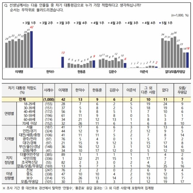 지난 4월 28일부터 30일까지 3일간 만 18세 이상 남녀 1천명을 대상으로 진행한 전국지표조사(NBS) 결과에 따르면 이재명 후보는 전체 응답자 가운데 42%의 지지를 받으며 차기 대통령 적합도에서 선두를 지켰다.