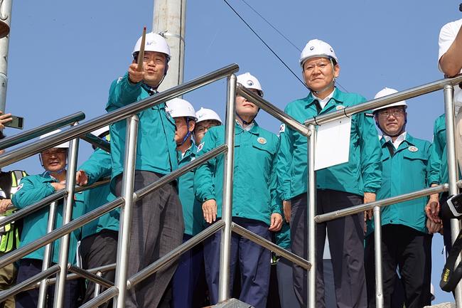 이상민 행정안전부 장관과 송미령 농림축산식품부 장관이 1일 오후 여름철 대비 충남 논산시 성동면 산동배수장 재해복구사업 현장을 방문하여 배수펌프 가동 점검 및 안전관리 등을 점검하고 있다.