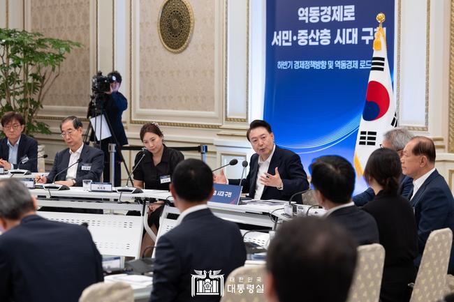 7월 3일, 윤석열 대통령이 청와대 영빈관에서 `2024년 하반기 경제정책방향`과 `역동경제 로드맵` 발표 회의를 주재하고 있다.