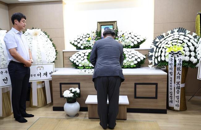 윤호중 행정안전부 장관이 21일 오후, 이태원 참사 당시 현장에 출동했던 故 박흥준 소방대원의 빈소가 마련된 안양 샘물병원장례식장을 찾아 조문하고 있다.